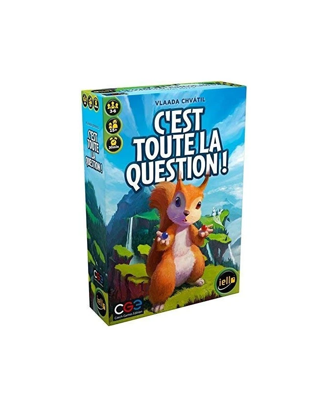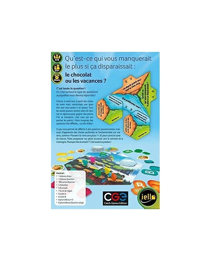 C’est Toute la Question ! Et c’est surtout le type de questions auxquelles vous devrez répondre ! Chacun à votre tour, à partir des cartes de votre main, construisez une question que vous posez à un joueur. Tous les autres joueurs tente alors de deviner sa réponse pour gagner des points. S’ils se trompent, c’est vous qui empochez les points ! Alors, imaginez des questions très difficiles… ou très drôles ! Ce jeu vous permet de réfléchir à des questions passionnantes, mais aussi d’apprendre des choses profondes et fondamentales sur vos amis, comme : « Peuvent-ils vivre sans pizza ? ». Et pour suivre le score de chacun, faites progresser vos petits écureuils vers le sommet de la montagne. Pourquoi des écureuils ? C’est toute la question !