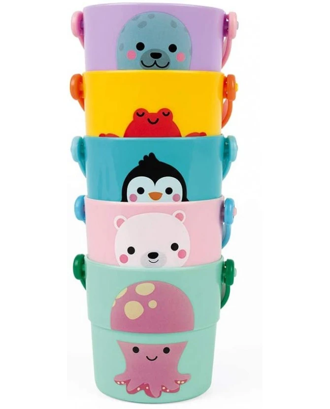 - CARACTÉRISTIQUES : 5 seaux colorés : bleu, vert, violet, rose et jaune, Sur chaque seau, une adorable illustration d’un animal aquatique : pingouin, phoque, poulpe, ours, crabe, Chaque seau à sa petite anse, Dimension de chaque seau : 9 cm de longueur, 9 cm de largeur et 11, 5 cm de hauteur,