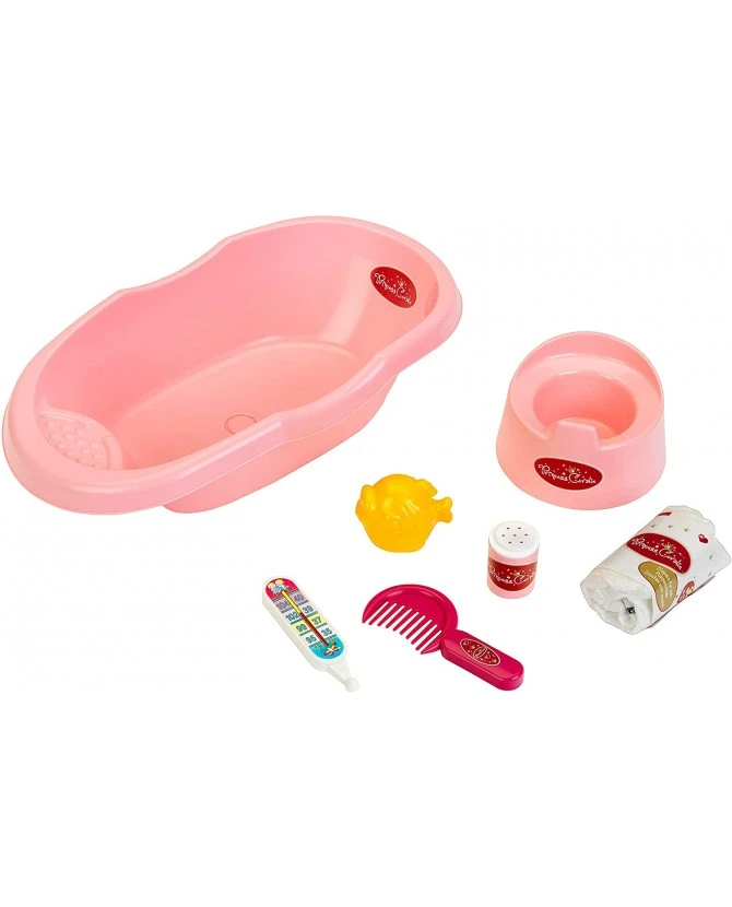 Convient à des poupées jusqu’à 35 cm. Composé d’une baignoire, d’un pot, d’une couche, d’un poisson-jouet, d’un thermomètre, d’un peigne et d’une boite à talc.