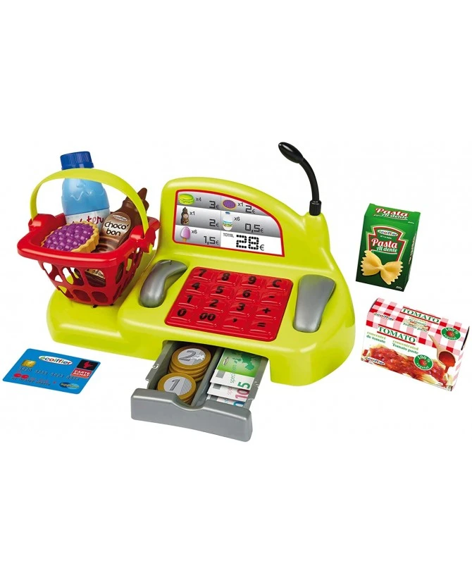 - Contenu du packaging: une caisse enregistreuse avec tiroir caisse garni de pièces et de billets lecteur de gencod téléphone micro panier et commissions. 26 accessoires
