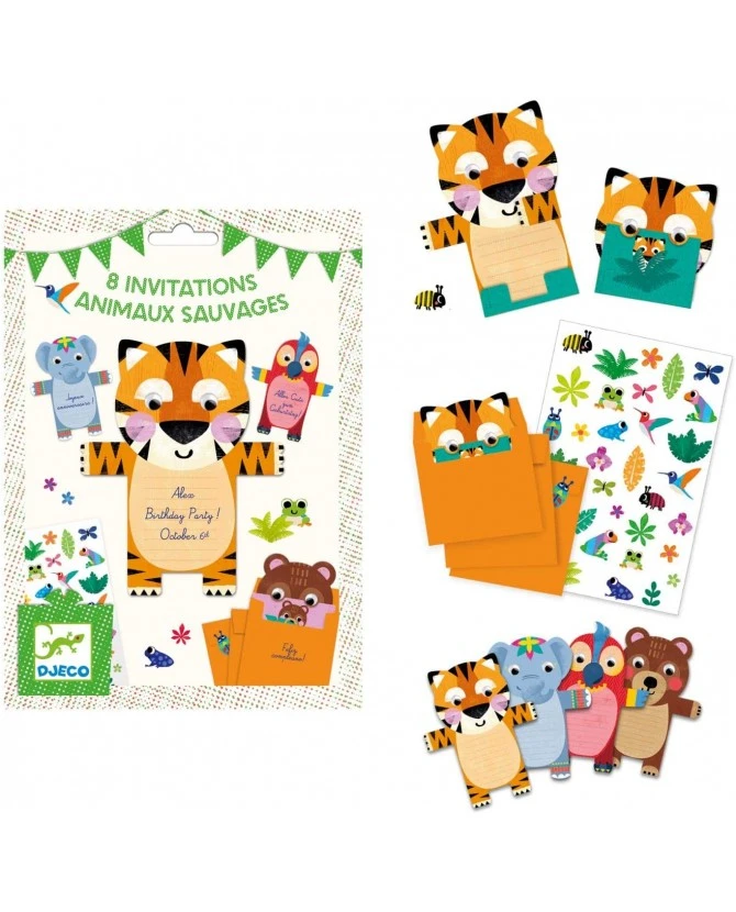 Des invitations toutes rigolotes sur le thème des animaux sauvages !. Contenu : 8 enveloppes, 8 cartes, 1 planche de stickers, 16 oeils. Dès 3 ans