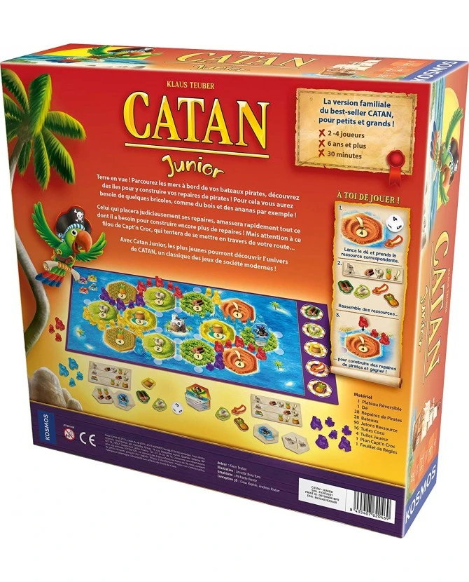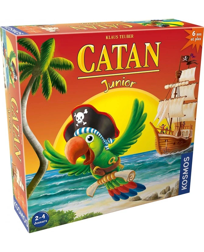 Le sort d’un pirate n’est pas toujours facile. Dans le but d’établir des forteresses et une force navale, il doit obtenir or, sabres, bois et laine. Mais ces ressources ne sont pas toujours à portée de main, c’est pourquoi il est parfois nécessaire d’échanger avec ses comparses pirates, en s’assurant de récupérer le plus de marchandises possible. Et si vous veniez à naviguer à contrecourant, ne vous en faites pas, votre fidèle compagnon Coco vous donnera certainement un coup de main ! Catan Junior permet aux plus jeunes d’apprécier l’expérience de Catan et de s’immerger dans cet univers riche en rebondissements. À bord moussaillons et soyez les bienvenus à Catan.