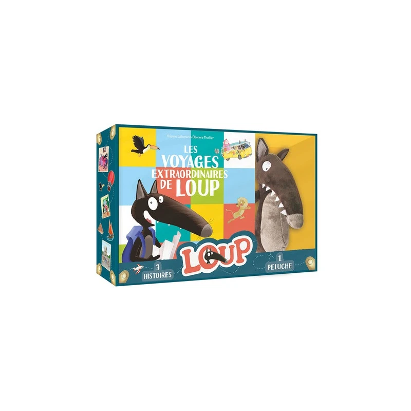Un coffret Loup avec un recueil de trois histoires sur le thème du voyage et une peluche. 3 histoires : Le loup qui voulait faire le tour du monde Le loup qui découvrait le pays des contes Le loup qui explorait Paris