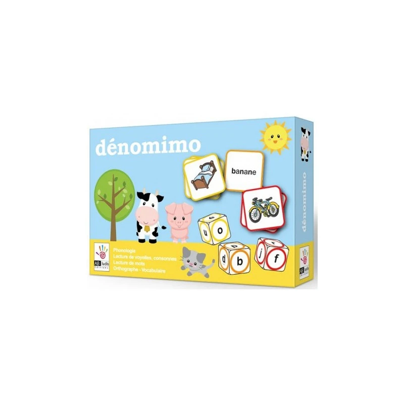 Contenu: 120 petites cartes carrées (image au verso, mot au recto – 4 x 4 cm) pour 3 séries: jaune, mots avec les voyelles : a – e – i- o – u – é, orange, mots avec les consonnes : p – b – t – d -m-n, rouge, mots avec les consonnes f – v – z – j – l- r, 3 dés ( 1 par série), règles.