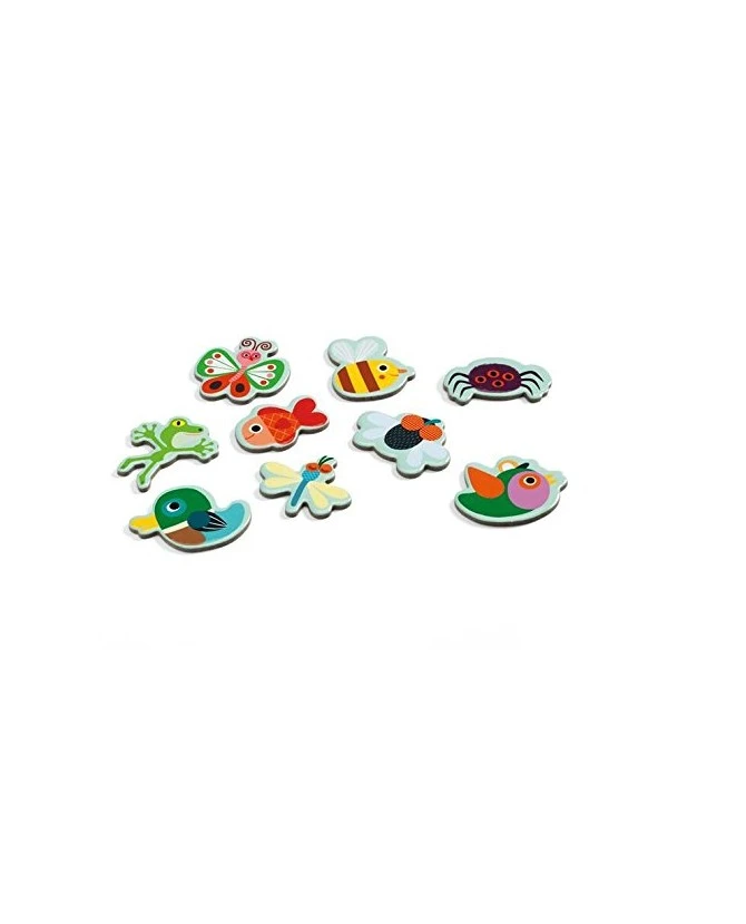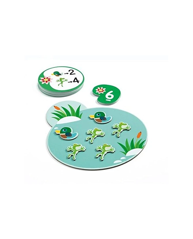 Contenu: 1 plateau en carton épais en forme de mare (L. 20,2 cm), 40 silhouettes d’animaux en carton rigide, 40 cartes questions -réponses, 9 cartes résultats en forme de nénuphar (de 2 à 9), règle.