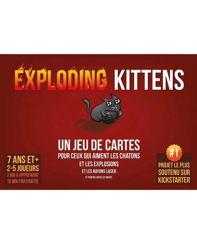 - Après un énorme succès sur Kickstarter, le jeu d’ambiance déjanté arrive enfin en français. Vous n’aurez dorénavant plus d’excuse pour vous lancer dans la bataille ! Exploding Kittens revisite la célèbre Roulette Russe dans un jeu de cartes où les chatons côtoient d’un peu trop près grenades, missiles nucléaires et torpilles dans un cocktail détonant ! À tour de rôle, les joueurs piochent des cartes du paquet jusqu’à ce qu’un joueur révèle un chaton explosif, provoquant sa mort et sa défaite pour la partie en cours. Les autres cartes permettent aux joueurs de se protéger des déflagrations, de forcer les autres à piocher plus ou à regarder les prochaines cartes avant de remélanger le tout. Le joueur qui a réussi à éviter toutes les explosions remporte la partie !