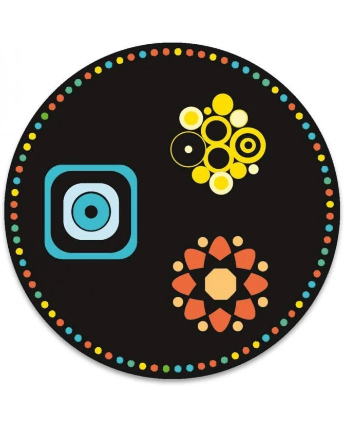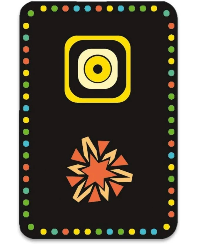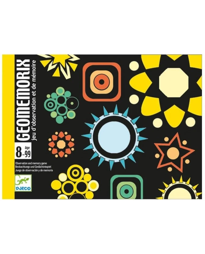 Un jeu graphique d’observation et de mémoire pour les petits et les grands. Deux types de cartes dans le jeu : des circulaires, placées sur la table, et des rectangulaires qui constituent la pioche, sur lesquelles des symboles de couleurs et de formes différentes sont représentés. Après avoir observé et mémorisé pendant quelques secondes l’emplacement des figures sur les cartes rondes, chaque joueur tente de les faire correspondre avec les symboles des cartes rectangulaires, qui doivent être de même couleur et de même forme, en retournant 1, 2 ou 3 cartes selon le nombre de symboles sur la carte rectangulaire. Si un joueur retourne les bonnes cartes, il remporte la carte qu’il a précédemment pioché. La partie est gagnée par le joueur qui a le plus de cartes rectangulaires à la fin du jeu. Observation, concentration et mémorisation sont nécessaires pour défier ses adversaires à ce jeu de memory revisité.
