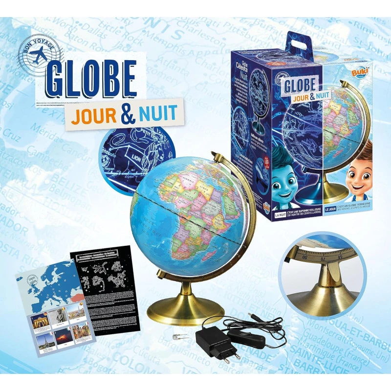 Un globe de 21 cm pour observer la Terre, le jour, et les constellations la nuit. Fonction Jour : Idéale pour étudier les frontières politiques, mers, montagnes, pays, villes et capitales. Fonction Nuit : Le globe s’allume lorsque tu appuies sur l’interrupteur et dévoile 88 constellations majeures. Globe monté diam. 21 cm sur armature métal (laiton). Fonctionne sur secteur. Notice illustrée avec des illustrations pour s’initier à la géographie. Dès 8 ans.