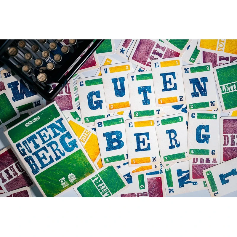 Jouable seul et jusqu’à six joueurs, Gutenberg offre un défi qui plaira aux joueurs et aux amateurs de lettres. Préparez vos lettres, créez des mots, réussissez des défis et planifiez votre dernière combinaison pour le tour final. Préparez vos lettres, créez des mots, réussissez des défis et planifiez votre dernière combinaison pour le tour final. Commencez par placer au milieu face visible deux lettres et une voyelle puis distribuez-en cinq à chaque joueur. Pendant les quatre premiers tours de Gutenberg, choisissez une de vos cinq cartes et passez les autres à votre voisin. On continue cet échange quatre fois. Pour remporter ce tour, essayez de former le mot au score le plus élevé avec vos lettres et les lettres communes du milieu. À la fin de chaque tour, vous pouvez ajouter une ou deux lettres et des défis à votre collection. C’est le joueur avec le mot de plus haut score qui choisit en premier. Au cinquième et dernier tour, utilisez le maximum de lettres de votre collection pour composer un dernier mot. Le joueur avec le mot de plus haut score l’emporte.