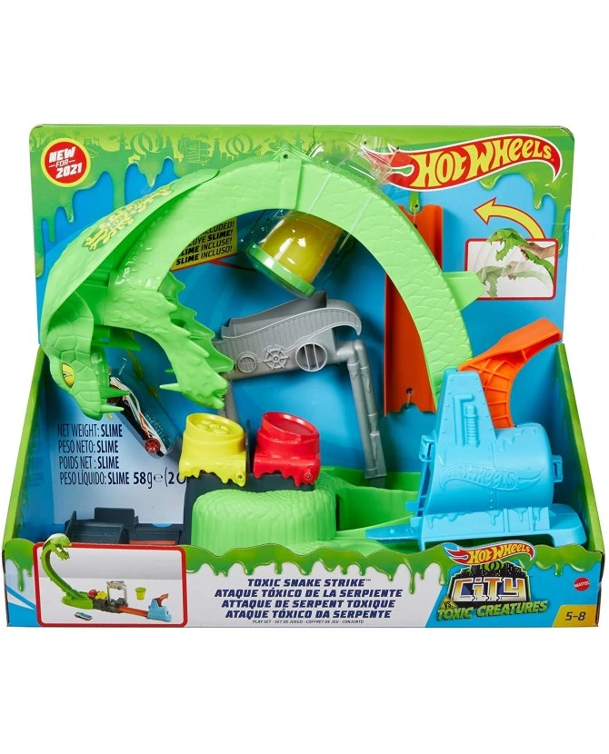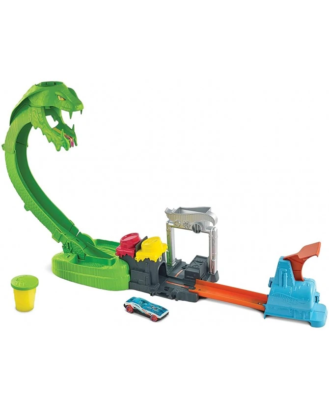 Ce Coffret Cobra Attaque Toxique de Hot Wheels comporte un obstacle impressionnant en forme de cobra toxique aux crocs pleins de slime vert, qu’il faut éviter avec votre voiture Hot Wheels. Si vous lancez la voiture trop doucement, elle risque de se retrouver enlisée dans le slime, mais en partant à la bonne vitesse, vous atterrirez sur l’un des deux boutons qui signent la défaite du redoutable ennemi. Ce coffret comprend un réservoir de slime réutilisable pour revivre à l’infini des courses excitantes, ainsi qu’un véhicule Hot Wheels à l’échelle 1:64. Ce coffret permet de jouer seul ou à plusieurs et se connecte à d’autres coffrets (vendus séparément). Les enfants de 5 ans et plus adoreront le côté visqueux de ce circuit. Les couleurs et les décorations peuvent varier.