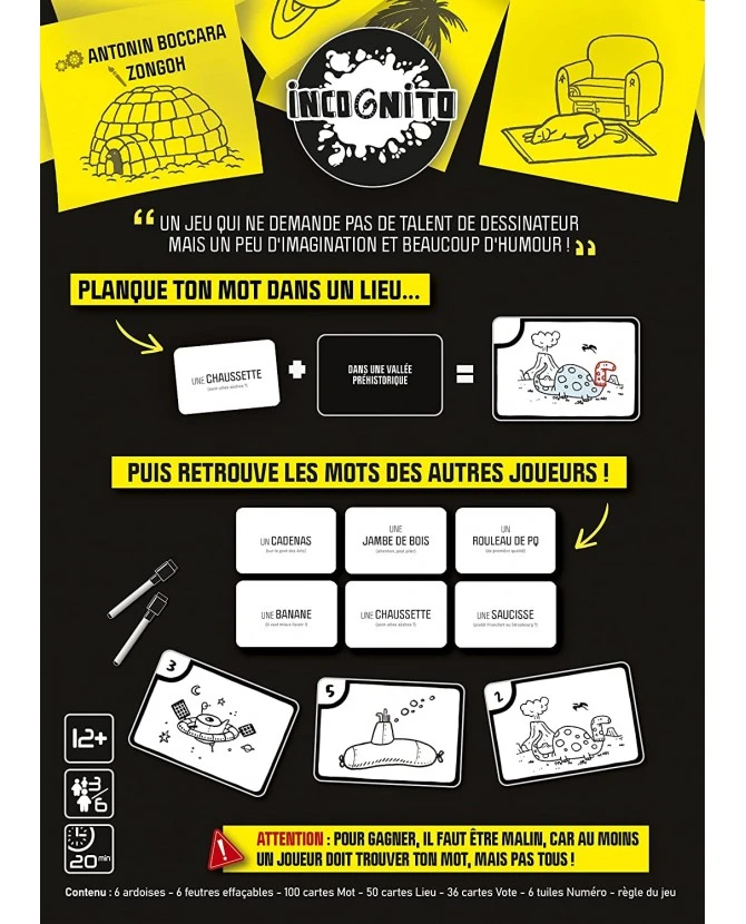 - Un jeu simple et amusant qui ne demande pas de talent de dessinateur mais un peu d’imagination et une bonne dose d’humour !