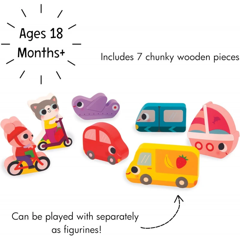 Contient un support et 7 pièces en bois. Dimensions du puzzle : Longueur 29.8 cm x Largeur 2,1 cm x Hauteur 20.8 cm. Matériau(x) utilisé(s) : Bois (contreplaqué de tilleul pour plateau + MDF pour les pièces). Tranche d’âge recommandée : de 18 mois à 3 ans.