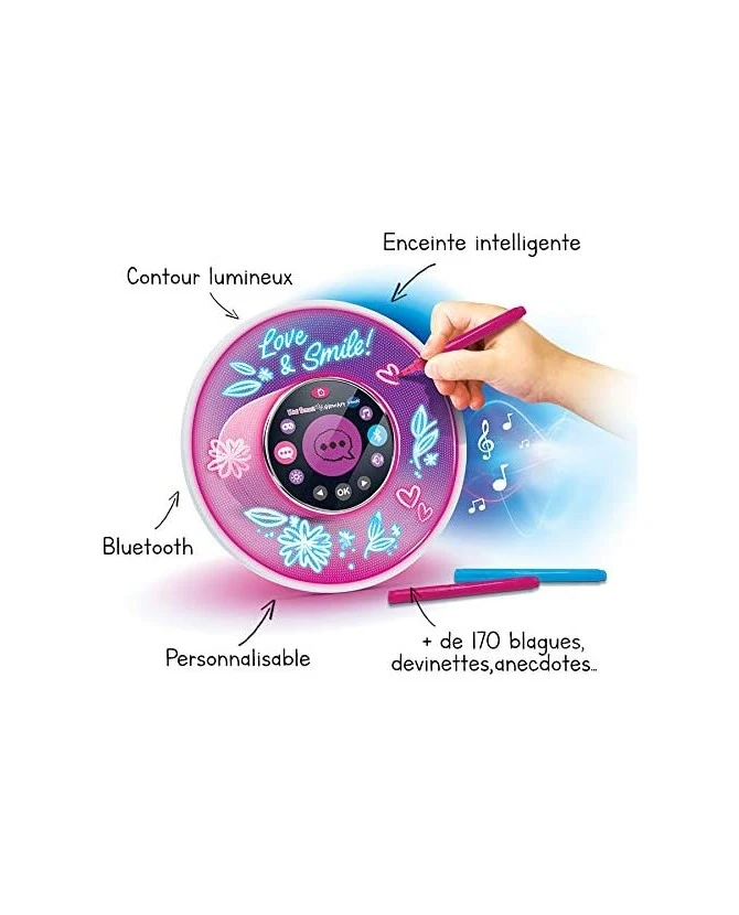 Kidi Smart Glow Art est une enceinte musicale intelligente avec effet néon conseillée pour les enfants dès 6 ans. Une enceinte 100 % personnalisable avec reconnaissance vocale ! L’enfant peut écrire et dessiner à l’infini sur le contour de l’enceinte avec les feutres effet néon. Les variations lumineuses font briller les dessins, et dans le noir, effet fluorescent garanti ! Magique, KidiSmart Glow Art répond à plus de 10 commandes vocales : Kidi quelle heure est-il, Kidi change de couleur …! Enceinte musicale : Possibilité d’écouter ses musiques préférées grâce la connexion bluetooth sécurisée. Ecran rétro-éclairé avec fonctions horloge parlante et réveil mais aussi 7 jeux. 15 mélodies et musiques déjà intégrées, 2 feutres néon et un tissu microfibre inclus. Fonctionne avec 4 piles LR6 fournies ou sur adaptateur secteur (vendu séparément).