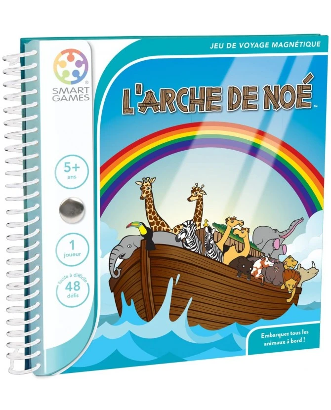 Pour s’amuser partout sans s’encombrer, quoi de mieux qu’un jeu de 48 défis en format de poche, où tous les éléments sont reliés ou aimantés au carnet qui contient tout le nécessaire de jeu? Votre mission? Embarquer mâles et femelles à bord de votre arche pour les sauver du déluge qui menace le continent. Après avoir choisi un défi parmi les 48 proposés, positionnez les premières pièces comme indiqué. Puis, à vous de placer les suivantes afin que chacun trouve se place à l’intérieur du bateau, à côté de son compagnon et la tête en haut pour supporter le long voyage en perspective! 4 niveaux de difficulté sont proposés pour occuper les neurones de tous les âges. Petits et grands auront donc de quoi s’amuser sur la route des vacances.