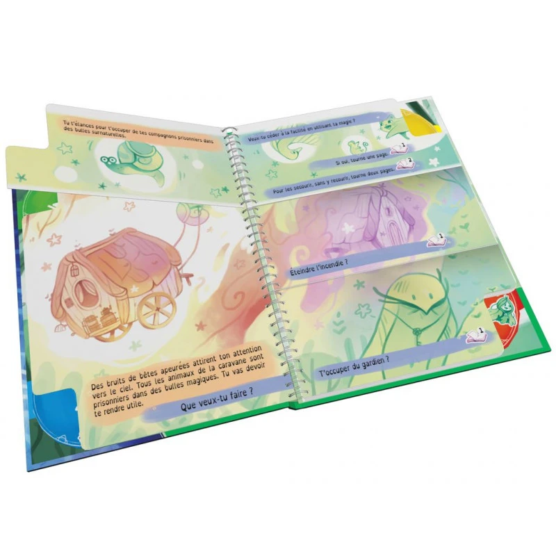 Crée ta propre histoire : à chaque page coupée en trois, tu devras faire un choix. Ouvre le livre et choisis-le magicien ou la magicienne que tu souhaites incarner : Lilon l’elfe des airs, qui vole et soigne toutes les misères ? Camille l’ensorceleuse, maîtresse des glaces pas frileuse ? Lucien le pyromancien, qui dompte les flammes au quotidien ?
