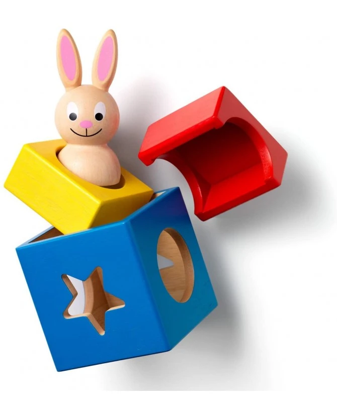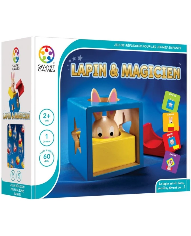Après avoir choisi une carte de défi, aux différentes couleurs selon le niveau de difficulté, le joueur devra reproduire l’image représentée. Tout d’abord avec 2 éléments de jeu (puis 3, puis 4 aux niveaux supérieurs) à identifier, il devra les placer devant lui comme sur l’image du défi. Suivant le développement de l’enfant dès 2 ans, Lapin & Magicien va lui apprendre à repérer l’emplacement des objets dans l’espace par la manipulation. Ce jeu lui permettra d’acquérir des notions essentielles comme dessus/dessous, dehors/dedans, à droite/à gauche. Les 60 défis proposés pourront l’accompagner dans son développement jusqu’à l’âge de 5 ans. Papa et Maman seront également sollicités pour contrôler le succès de leur enfant, à l’aide du livret de solutions si nécessaire !