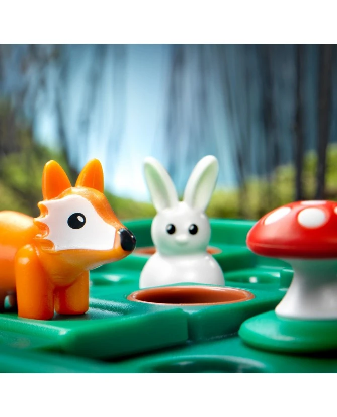 On peut même y croiser des lièvres et des renards en pleine activité! Choisissez un défi parmi les 60 proposés et posez les lièvres, champignons et renards comme demandé. Faites alors bondir vos lièvres!! Sans oublier de mettre quelques obstacles sur leur parcours, obligatoires pour permettre leur déplacement. Certaines obstacles sont fixes, d’autres sont mobiles… A vous de trouver les meilleures opportunités de mouvements pour les aider à rejoindre leur abri au plus vite!