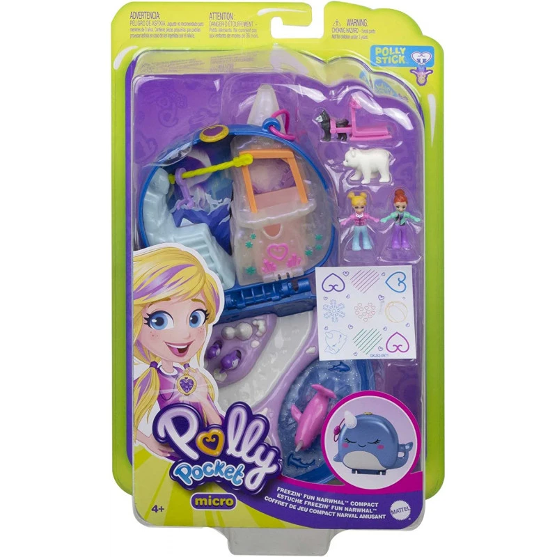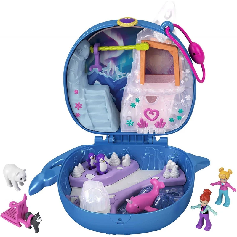 - Ce coffret voyage en arctique de Polly Pocket a la forme d’un narval avec une frimousse craquante, une corne torsadée et une queue rigolote. Décor polaire propice à l’aventure, les poupées Polly et Lila, un husky avec un traîneau et un ours blanc !