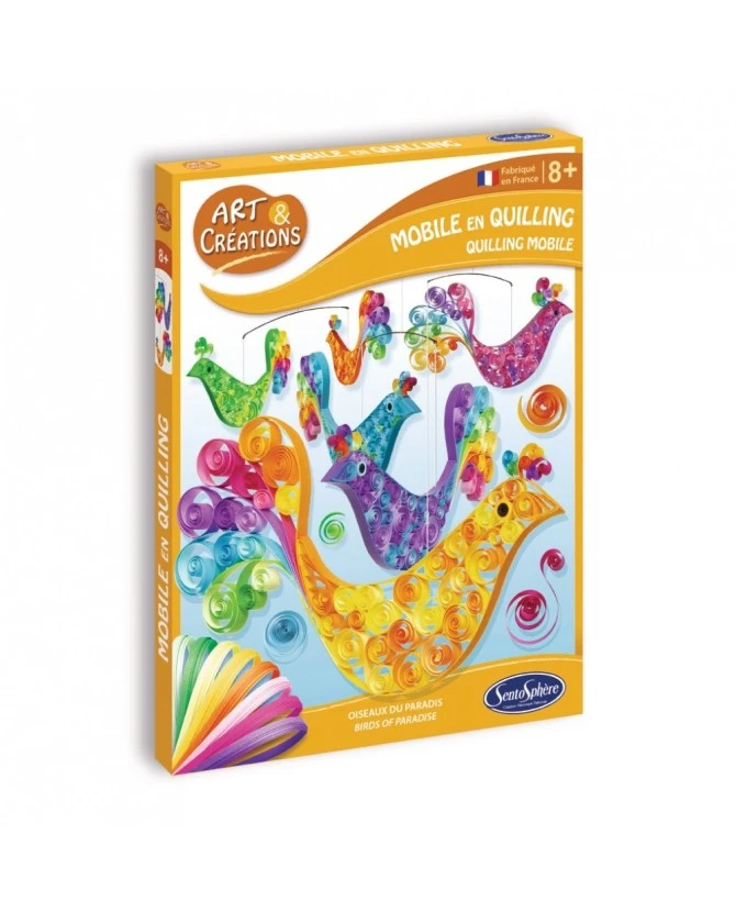 Le quilling est une activité permettant de réaliser des formes multiples en filigrane de papier, reliées par de délicats points de colle. Cette technique aurait vu le jour chez des sœurs après l’apparition du papier et pour remplacer le métal. Dans ce coffret, tous les outils fournis permettent de réaliser facilement des mobiles aériens et multicolores composés de 6 oiseaux ou 6 papillons.