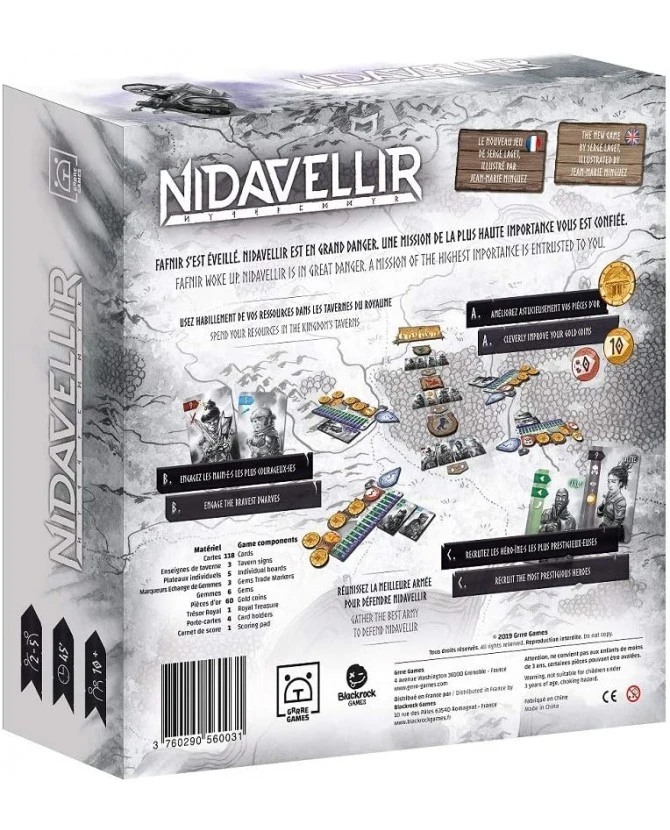 - Contenu : 87 cartes Nain.e, 5 cartes Disctinction, 5 cartes Offrande Royale, 21 cartes Héros.ïne, 3 enseignes de taverne, 5 plateaux individuels Carte du Royaume, 3 marqueurs Echange de gemmes, 6 gemmes, 60 pièces d’or, 1 Trésor Royal, 4 porte-cartes, 1 carnet de score.