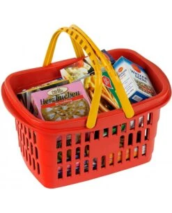 Panier à double anse. Livré avec de nombreuses boîtes d’aliments factices.
