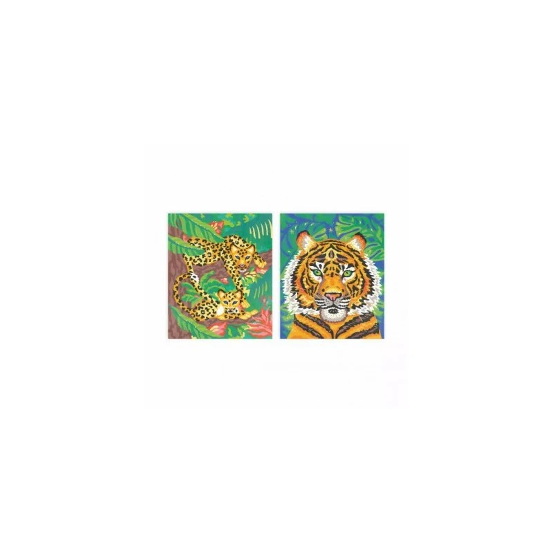 Découvrez le coffret peinture au numéro aquarelle Félins de la collection Les Ateliers du Calme de Janod, une activité créative pour les enfants dès 7 ans, permettant de réaliser deux tableaux colorés représentant un tigre et des panthères.