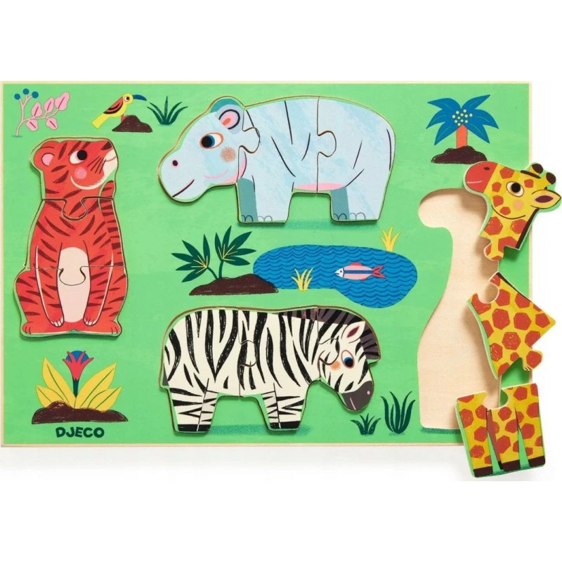 Découvrez le puzzle Coucou Tigre de Djeco, un puzzle à encastrer en bois sur le thème des animaux de la savane pour les enfants dès 18 mois.