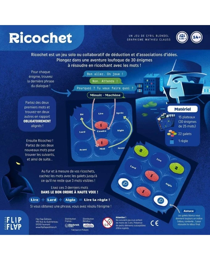Deuxième opus des aventures d’agents secrets loufoques avec 30 énigmes à résoudre par associations d’idées en faisant des ricochets de mot en mot pour trouver le bon chemin et résoudre le rébus final! Chaque énigme est constituée d’un dialogue dont il faut découvrir la dernière phrase pour comprendre l’histoire. Les deux premiers mots sont donnés. On cherche sur la grille deux mots dans une même ligne ou une même colonne qui ont un rapport avec les deux premiers. Chaque couple de mots amène ainsi au couple de mots suivants, jusqu’à ce que tous les galets soient posés. A la fin, les mots encore visibles forment un rébus qui, une fois lu à haute voix dans le bon ordre, permet aux joueurs de découvrir l’énigme! Ce jeu est incroyable, complètement innovant et tout à fait passionnant, pour jouer seul ou à plusieurs.