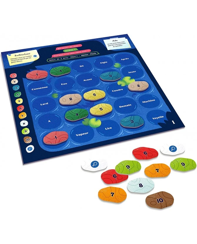 Contenu: 15 plateaux réversibles pour 30 énigmes (19 x 19 cm), 22 galets numérotés en carton pour cacher les mots quand on a trouvé les suivants, règle.