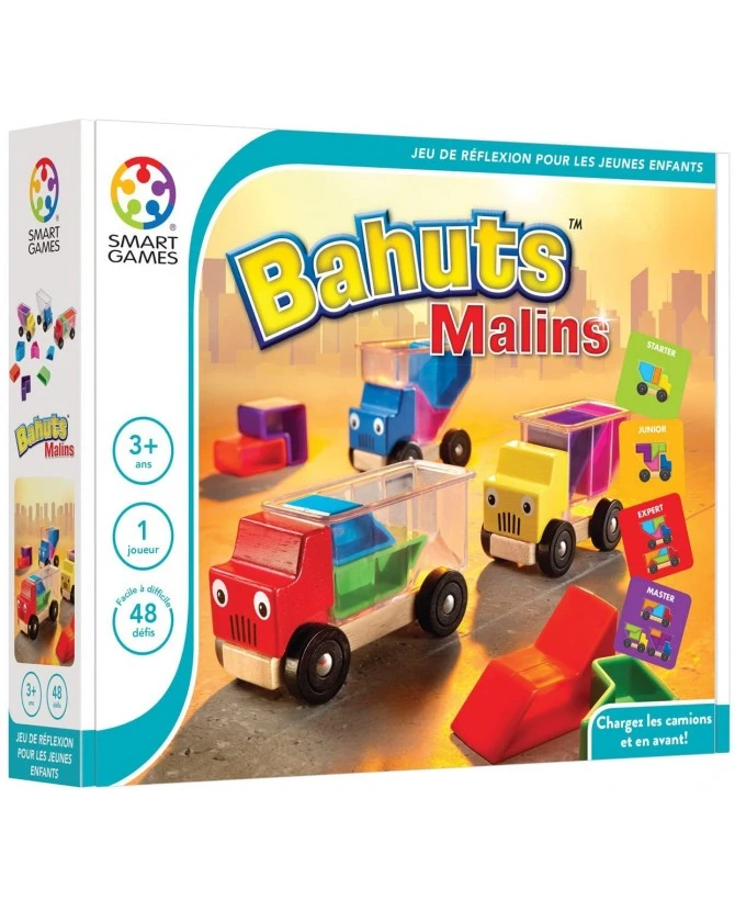 Embarquez vos colis et roulez vers d’autres aventures! Les trois camions Groseille, Citron et Pruneau sont en chemin vers leur prochaine destination. Ils doivent transporter des affaires, mais ils ne savent pas si elles tiendront toutes dans leurs bennes transparentes. Pouvez-vous les aider Ă tout emporter ?. . Bahuts Malins est un jeu de rĂ©flexion Ă©volutif qui suivra les progrès accomplis par votre enfant. Il considĂ©rera d’abord les camions en bois comme des jouets qu’il pourra remplir et dĂ©placer. Ensuite, il voudra rĂ©soudre les 48 dĂ©fis qui lui seront proposĂ©s dans le livret. Les exercices sont d’abord faciles et gagnent ensuite en complexitĂ©.. . But du jeu : Encastrer les colis dans les camions selon le dĂ©fi choisi. Niveau : 48 dĂ©fis, 4 niveaux de difficultĂ©, Ă partir de 3 ans