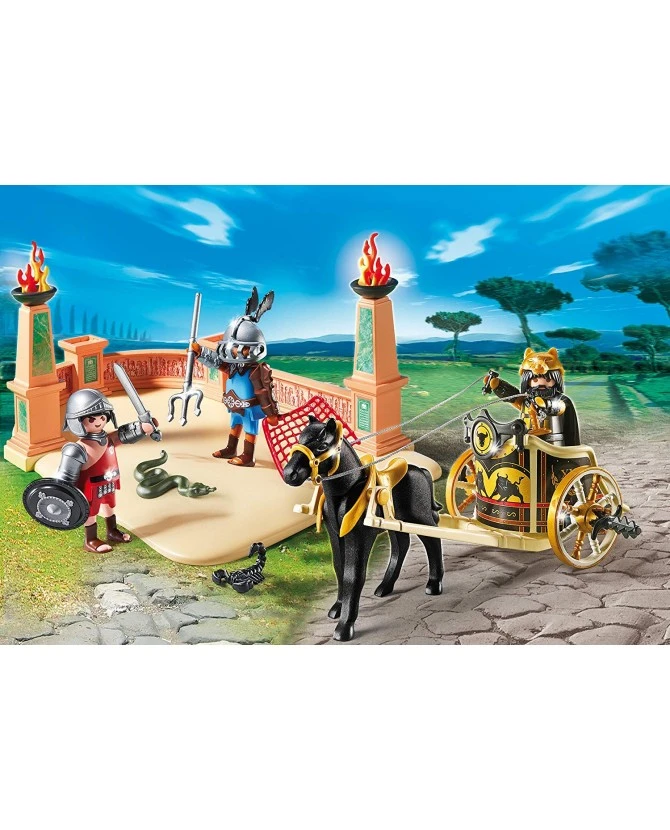 Arène romaine et char de combat. Comprend un cheval avec harnais et un char de combat armé. Le gladiateur peut être fixé debout sur le char.