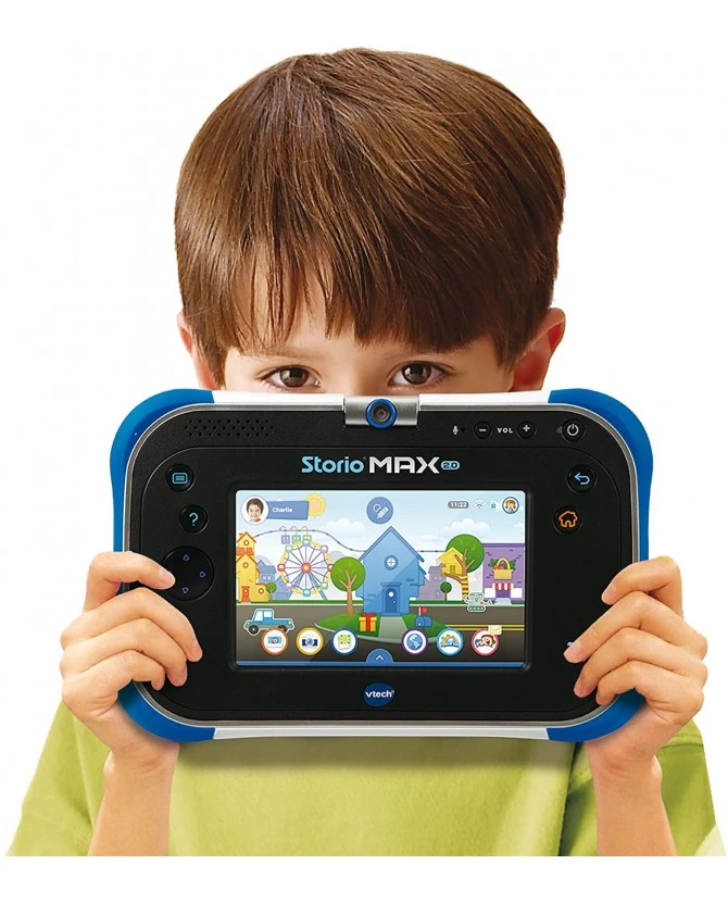 – Studio de dessins et coloriages – Appareil photo rotatif (2 MP) – CamĂ©scope, lecteur vidĂ©o – Lecteur de musique (prise casque ou haut-parleur) – Outils pratiques : horloge, chronomètre, calendrier, bloc-notes – ContrĂ´les parentaux : possibilitĂ© de contrĂ´ler le temps de jeu, les profils d’utilisateurs, les paramètres d’accès au Wi-Fi, etc. – Navigateur internet sĂ©curisĂ© – Evolutive : La Storio Max 2.0 bleue Ă©volue avec votre enfant grâce aux nombreuses cartouches de jeux Storio HD disponibles et Ă plus de 2000 applications (dĂ©veloppĂ©s par VTech et par nos partenaires) tĂ©lĂ©chargeables sur l’Explor@ Park. 8 Go de mĂ©moire extensible jusqu’Ă 40Go via une carte micro SD non incluse. Batterie Lithium rechargeable, cartouche de dĂ©mo de jeux, câble USB. *sur inscription au Club VTech
