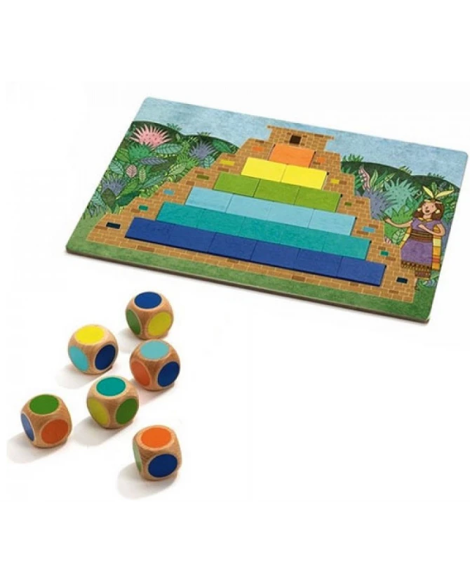 Contenu : 4 planches pyramide, 84 blocs en bois, 6 dés, 1 règle du jeu, dans une boîte de dimensions 30 x 28 x 4 cm.