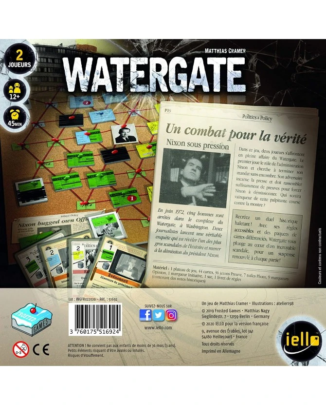 Watergate est un jeu tactique plein de tension, qui invite les joueurs à effectuer des choix stratégiques cornéliens pour atteindre leurs conditions de victoire avant l’adversaire. Fort de sa thématique totalement imprégnée dans le jeu, il permet de créer des duels épiques sur fond de scandale politique.