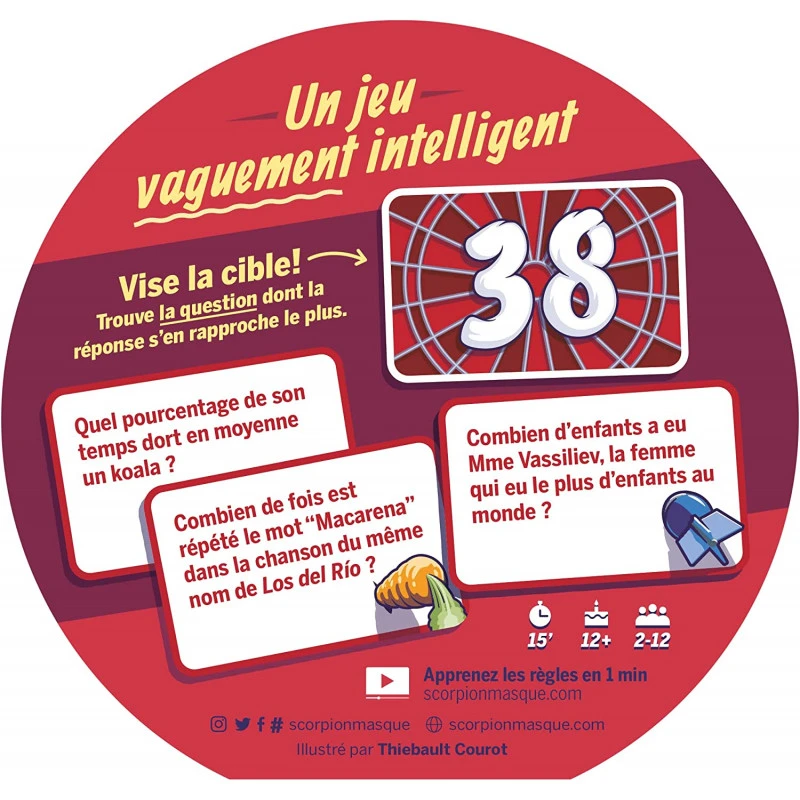 Un jeu vaguement intelligent ! Discutez avec votre équipe pour trouver laquelle de vos cartes Question comporte la réponse la plus proche de la cible. L’équipe la plus éloignée de la cible doit reprendre une carte. La première équipe à qui il ne reste qu’une seule carte l’emporte !